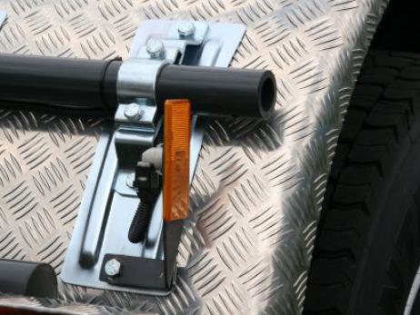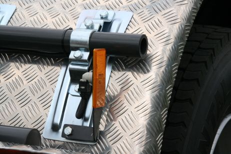 Grundrahmen aus zwei geschlossenen Stahl-Längsträgern mit Quertraversen; an der Rückseite ist eine Drehwelle zur Aufnahme des Kipprahmens sowie eine Abrollvorrichtung gelagert; an der Vorderseite sind zwei Hubpressen-Halterungen angebracht.