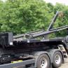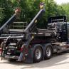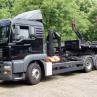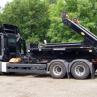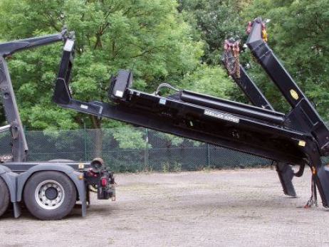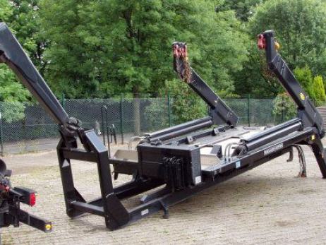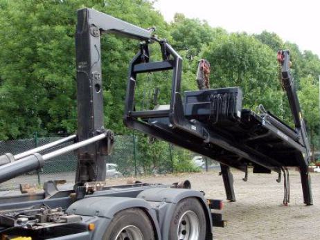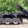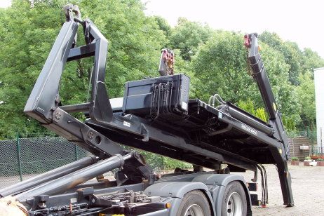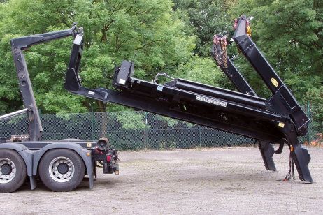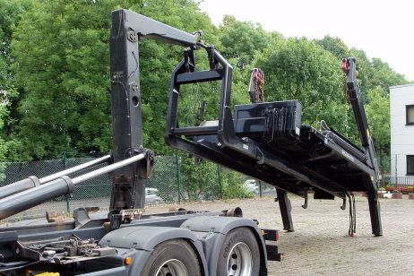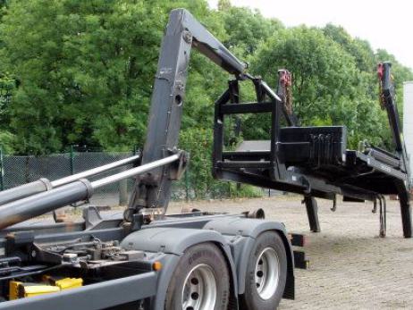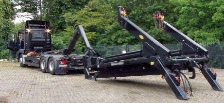 Auf einen normalen Abrollkipper für ein Dreiachs-Fahrgestell wurde ein seperater Abrollträger mit Absetzkipper aufgebaut.
