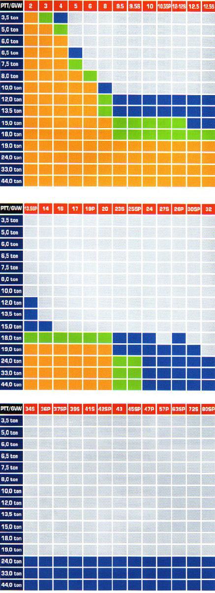 Dort sind in der ersten Spalte die einzelnen Krantypen dargestellt. In der ersten Spalte sind Fahrzeuggesamtgewichte aufgeführt.