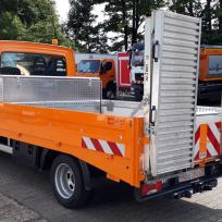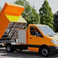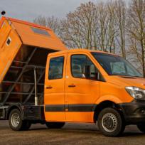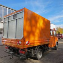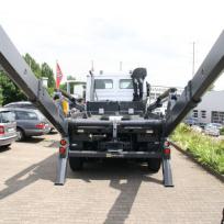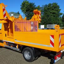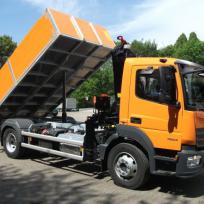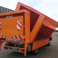Kombination aus Kran-Pritsche und Rückwärtskipper. Eine feste Ladefläche ist für Besen, Schüppen etc. vorhanden. Sand und Splitt lassen sich seperat transportieren und zum Heck kippen.