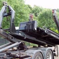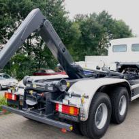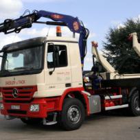 Kombination aus Abrollkipper mit Lkw-Ladekran. In diesem Fall wird der Ladekran fest vor den Abrollkipper aufgebaut.