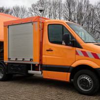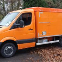 Kehrrichtsammelfahrzeug mit Aluminiumaufbau. Aufgebaut auf einen Mercedes Sprinter. Der Aufbau wird über eine Elektrohydraulik gekippt.