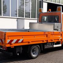 Sammelfahrzeug mit seperater fest angebauter Werkzeugbox auf dem Chassis. Der Kippaufbau ist in dem Bereich ausgeklinkt.