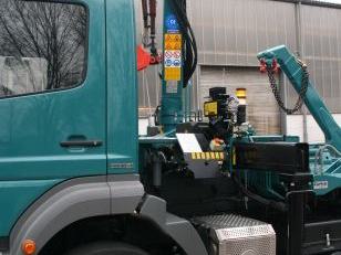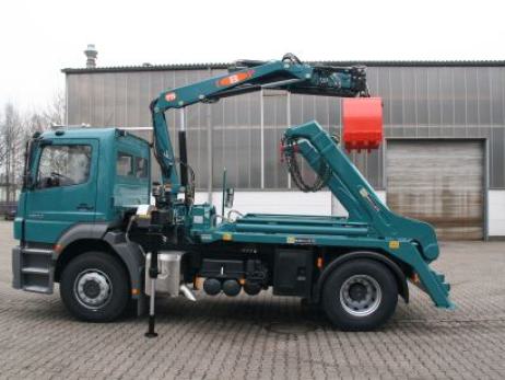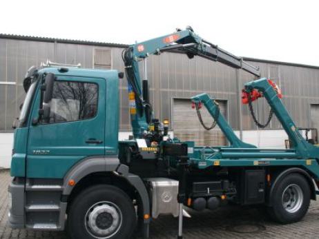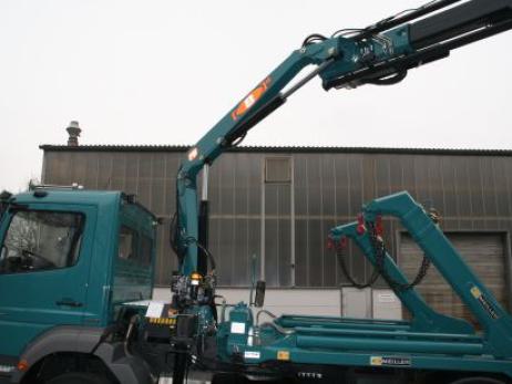 Es wurde ein Ladekran PM 8522 LCauf einen Absetzkipper Typ Meiller 10 NT aufgebaut. Die Achsverteilung ist gut.