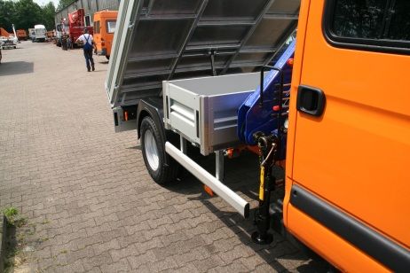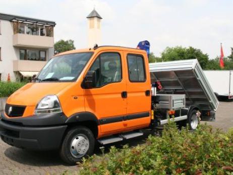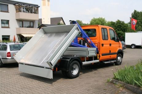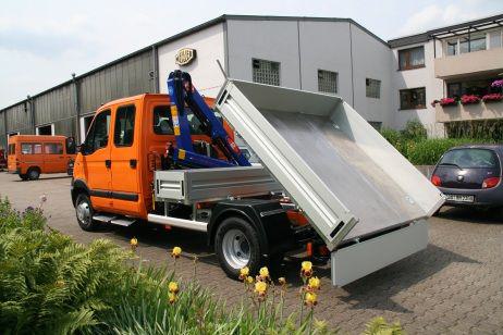 (mit Fahrer, vollem Tank, aufgebautem Kran und Kipper)