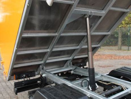 Der Kipper ist nach hinten zu kippen. Angetrieben wird die Hydraulik über ein Elektroaggregat.
