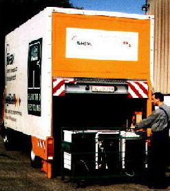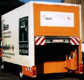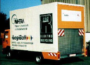 Besonderheit des Systems sind die speziellen Sammel- und Transportbehälter, in denen "weiße Ware" (große Haushaltsgeräte), Kühl- und Gefriergeräte sowie "braune Ware" (Fernseher, Bildschirme und elektronische Geräte) entsprechend ihrer späteren Verwertung von vornherein getrennt gesammelt werden können. Herzstück des Fahrzeuges ist eine spezielle Fördertechnik: Sie bewirkt, daß die gefüllten, fahrbaren Boxen vollautomatisch von der Straße aufgenommen und in zwei übereinander liegende Ebenen gestapelt werden. Dabei gestattet die neuartige Mechanik sowohl das schnelle Be- und Entladen als auch das Verschieben der Behältnisse gegeneinander. Auf diese Weise lassen sich neun Container unterbringen. Werden volle gegen leere Gefäße ausgetauscht, ist Platz für einen zusätzlichen Behälter vorhanden. Den Angaben zufolge ist bei allen logistischen Vorgängen die Arbeitssicherheit gewährleistet.