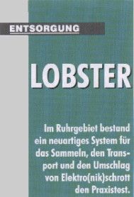"Wer unter der Bezeichnung "LOBSTER" eine Delikatesse aus dem Meer vermutet und an die englische Übersetzung des Wortes "Hummer denkt, der wird ein solches Schalentier auf Hernes Straßen nicht finden. Denn es geht bei "LOBSTER" nicht um kulinarische Genüsse, sondern um ein neuartiges System zur "Logistik bei Sammlung md Transport für das Elektronik-Recycling', das in Herne seit September 1998 im Probebetrieb eingesetzt wird.