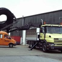 Auf einem Scania Lkw wurde ein amerikanischer Ladekran zum Montieren und Demontieren von großen Reifen aufgebaut. Das Fahrzeug war auch mit einem Kompressor ausgerüstet.