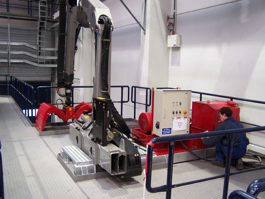 Der Kran steht in 5 m Höhe über dem Boden auf einem Podest.