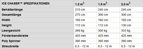 Verfügbar in 395 cm Kapazitäten (Available in 215- and 245-cm lengths, with 1.2-, 1.5- and 2.0-m3 capacities), gibt es auch den richtigen ICE CHASER für Sie.
