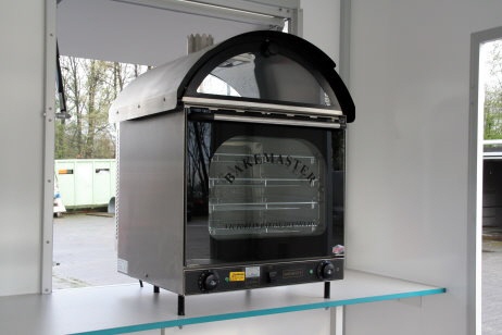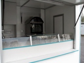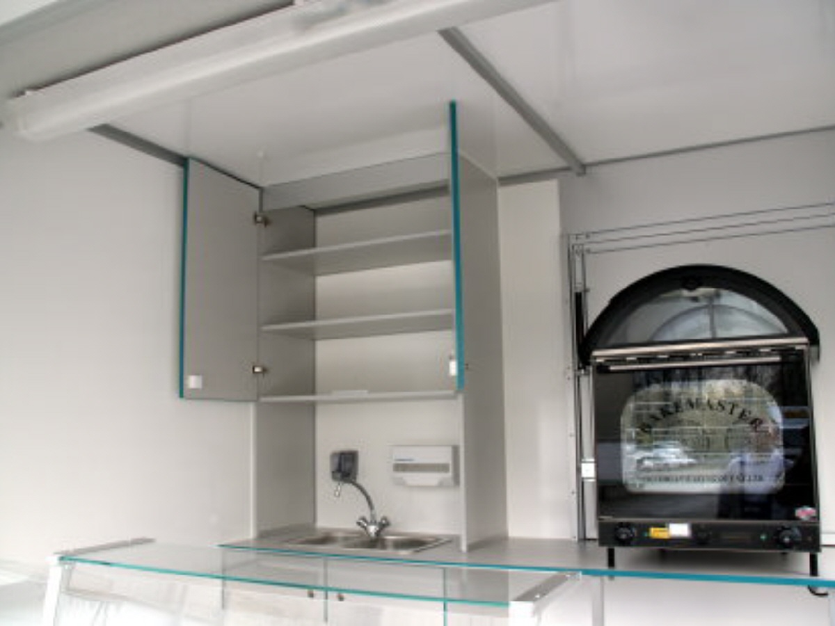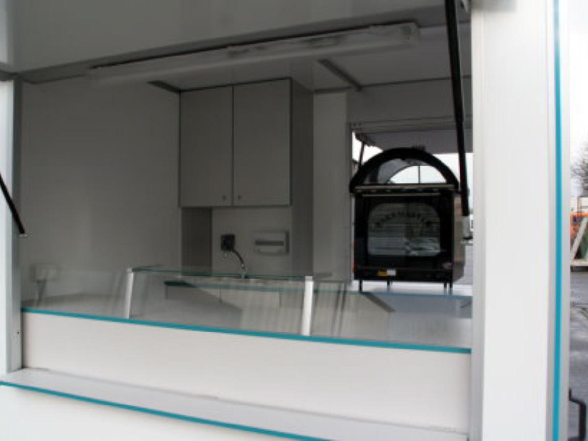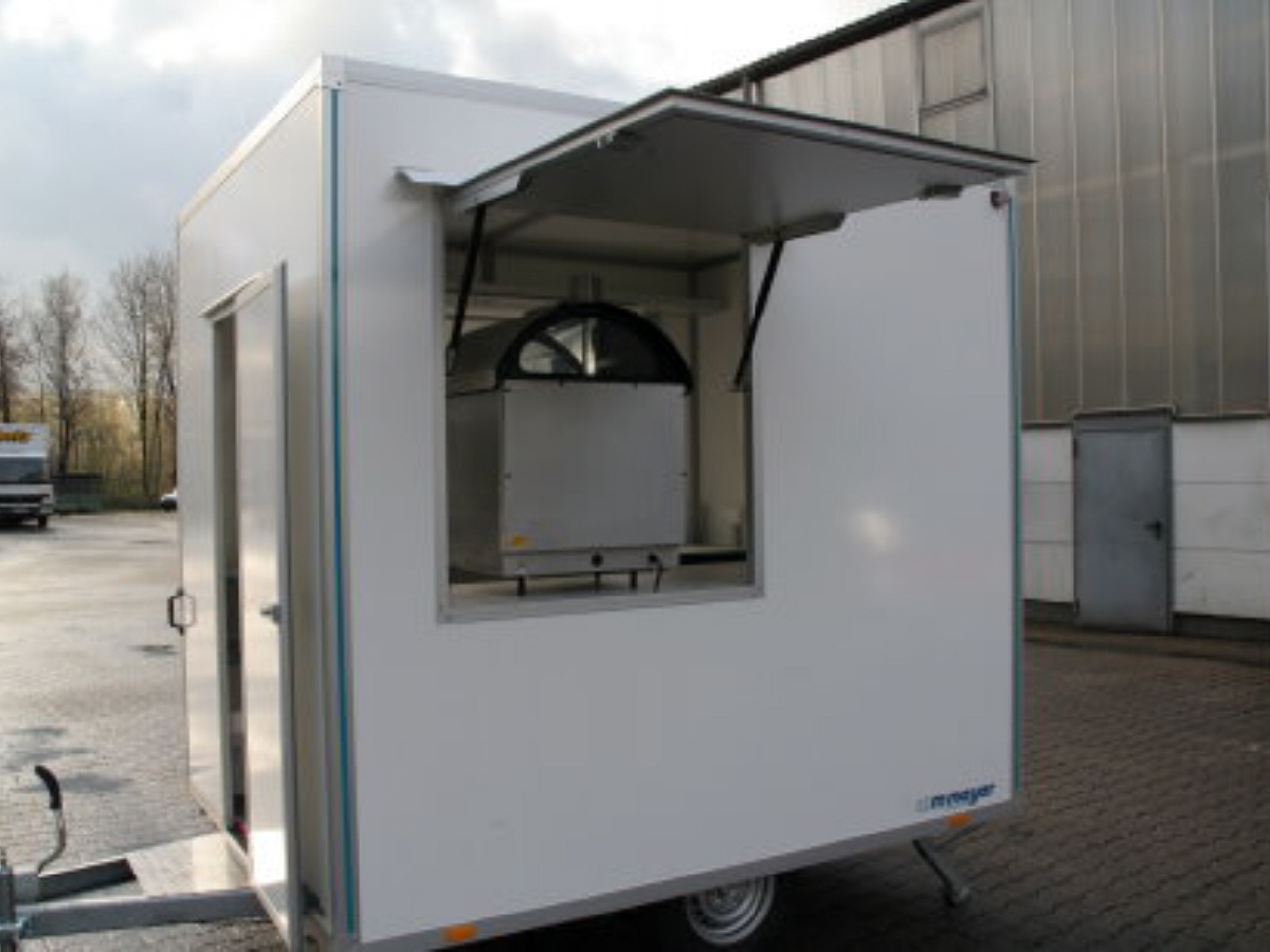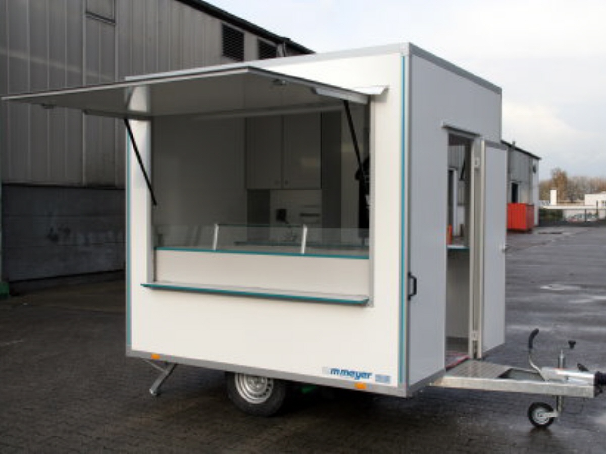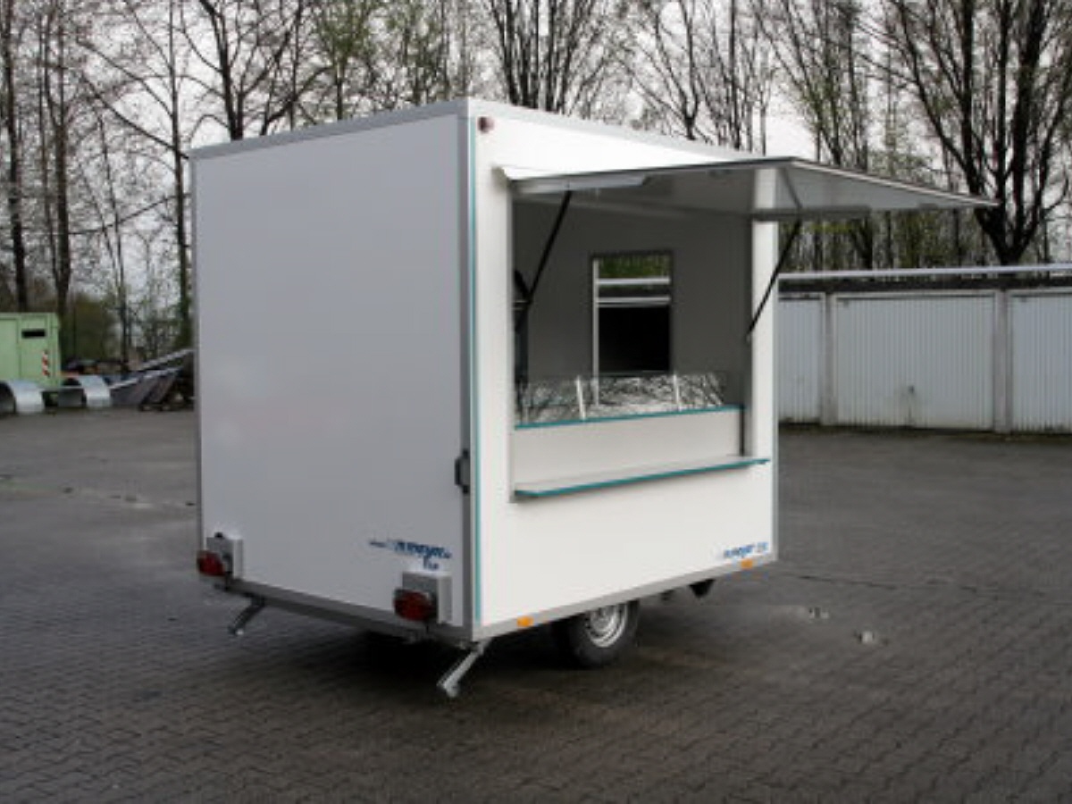 1 Eingangstüre im Bug, abschließbar, 1 Verkaufsklappe Serie mit Gasdruckfedern, 2 Rangiergriffe, 4 Ausdrehstützen mit Kurbel, 80-km/h-Ausführung, Alu-Einstieg auf der V-Deichsel in Riffelblech, Alu-Profile eloxiert.