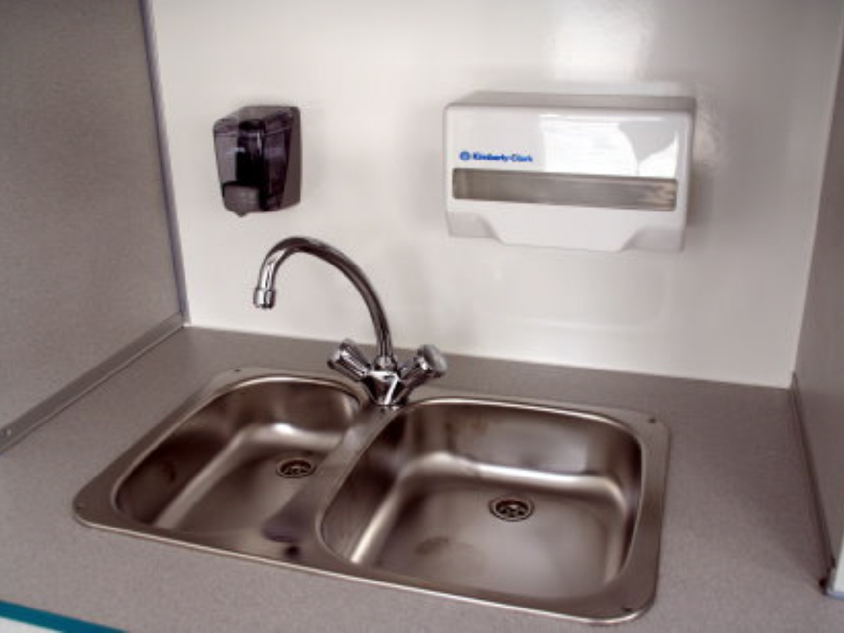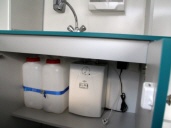 Hygienemodul: Doppelspüle mit Unterschrank und Warmwasserboiler 5l, Wasserver- und entsorgung, Frisch- und Abwasserkanister (je 15 Liter); Hygienepaket: Seifenspender und Papierhandtuchhalter